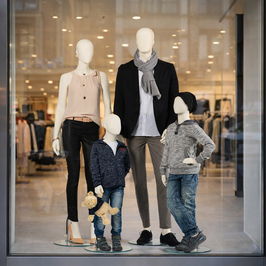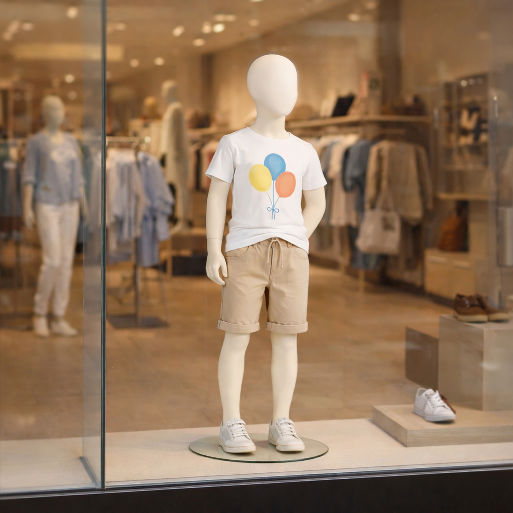 - Lieferumfang: Kinder-Schaufensterpuppe inkl. runder Glasstandplatte