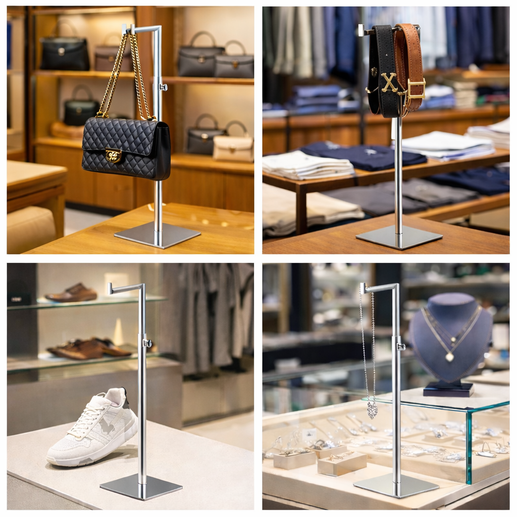 - Der verchromte Ständer für Accessoires mit speziellem L-Halter für Taschen, Ketten, Bänder, Tücher, etc.