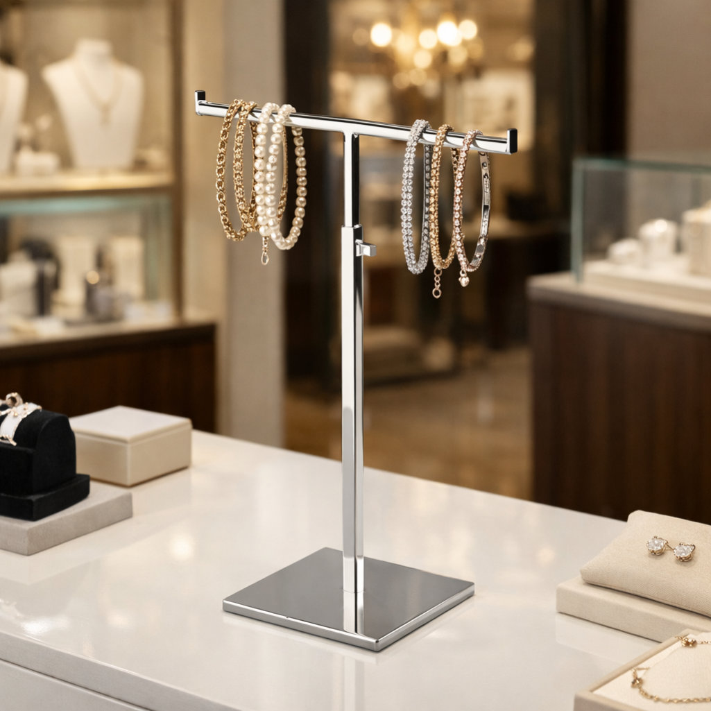 - Der verchromte Ständer für Accessoires mit speziellem T-Halter für Taschen, Ketten, Bänder, Tücher, etc.