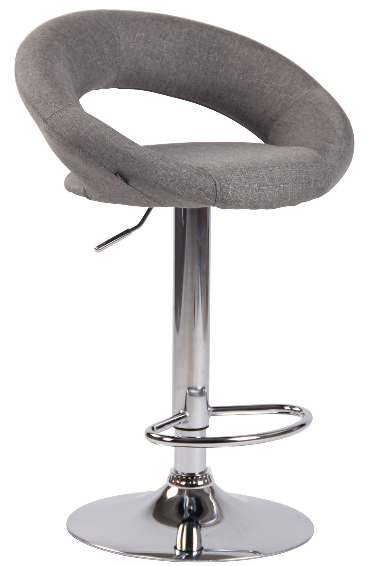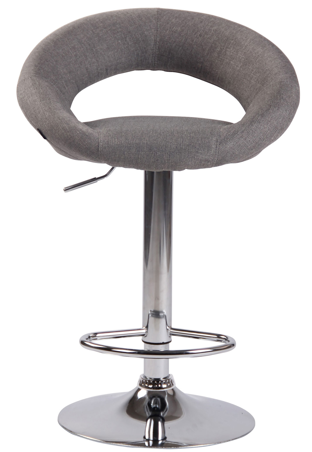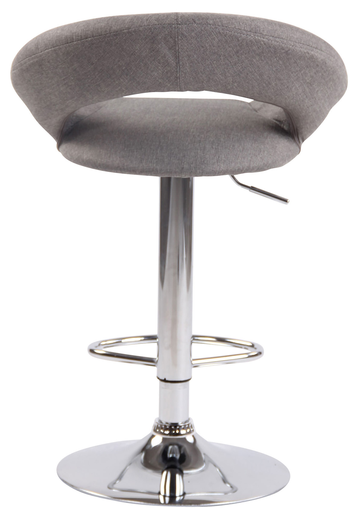 Der Sitz ist mit einem pflegeleichten Stoffbezug versehen und besonders bequem gepolstert, die umlaufende Lehne sorgt für zusätzlichen Komfort. Der Thekenhocker ist mittels Gaslift höhenverstellbar sowie um 360° drehbar. Die angebrachte Fußstütze lässt sich synchron mit der Höhe der Sitzfläche einstellen, wodurch ein bequemes Sitzen über mehrere Stunden möglich ist. Der Trompetenfuß aus Metall ist mit einem Bodenschoner ausgestattet, wodurch Kratzer und Beschädigungen auf dem Boden verhindert werden.