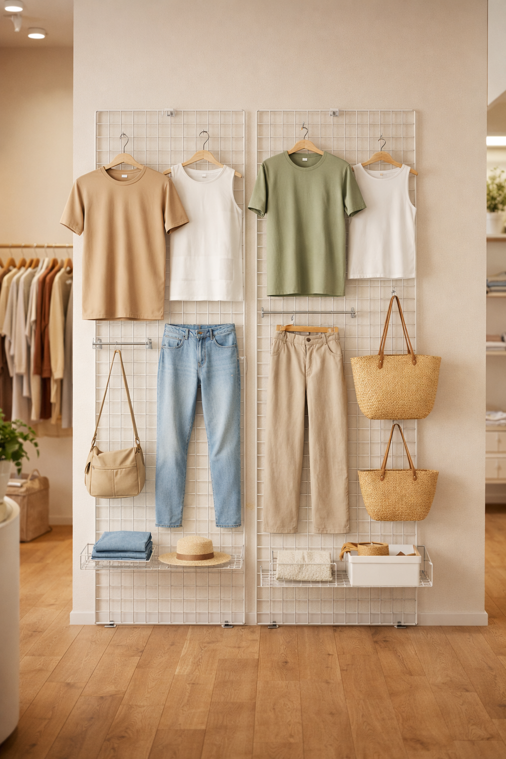 Das Deko Wandgitter im Set ist in jeder Textil Ladeneinrichtung optimal einsetzbar.