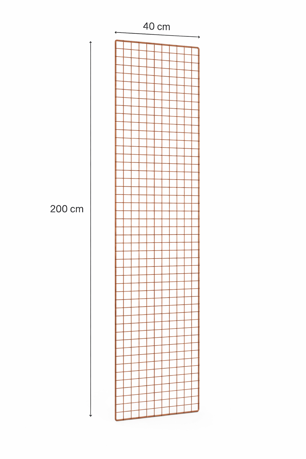 Bringen Sie mit dem Deko Wandgitter in Kupfer Glanz in Ihre Verkaufsfläche! Mit einer Höhe von 200 cm und einer Breite von 40 cm bietet es reichlich Platz zur kreativen Gestaltung. Die Maschenweite von 50 mm und die robuste Drahtkonstruktion (Rahmen Ø 10 mm, Gitter Ø 5 mm) sorgen für Stabilität und ein modernes Erscheinungsbild.