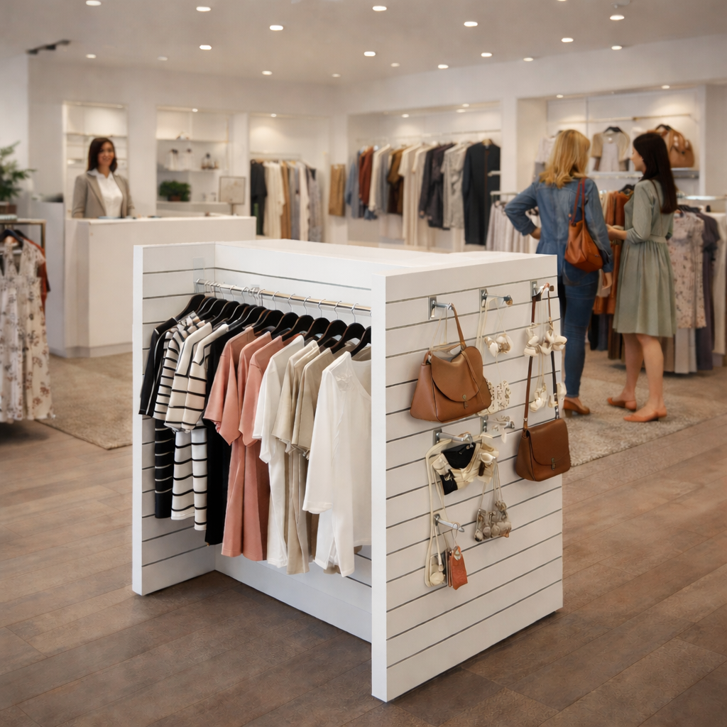 Der Textilständer für Mittelraum hat die Maße H 120 x B 60 x L 120 cm. Die Lamellenwand hat die Stärke 38 mm. Die Aluminium-Einschubprofile sind im Lieferumfang enthalten. Die Wände sind HMB-beschichtet, was bedeutet, dass die Oberfläche äußerst strapazierfähig, glanz- und farbecht sowie temperatur- und klimabeständig ist. Der Textilständer in H-Form ist in der Farbe Weiß. Die Lieferung erfolgt zerlegt.