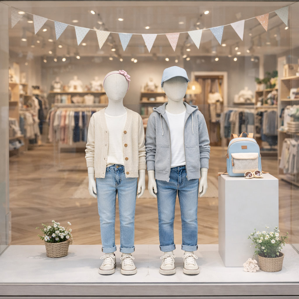 - Lieferumfang: Kinder-Schaufensterpuppe inkl. runder Glasstandplatte, Kit mit Aufbauanleitung, Handschuhe, Radiergummi