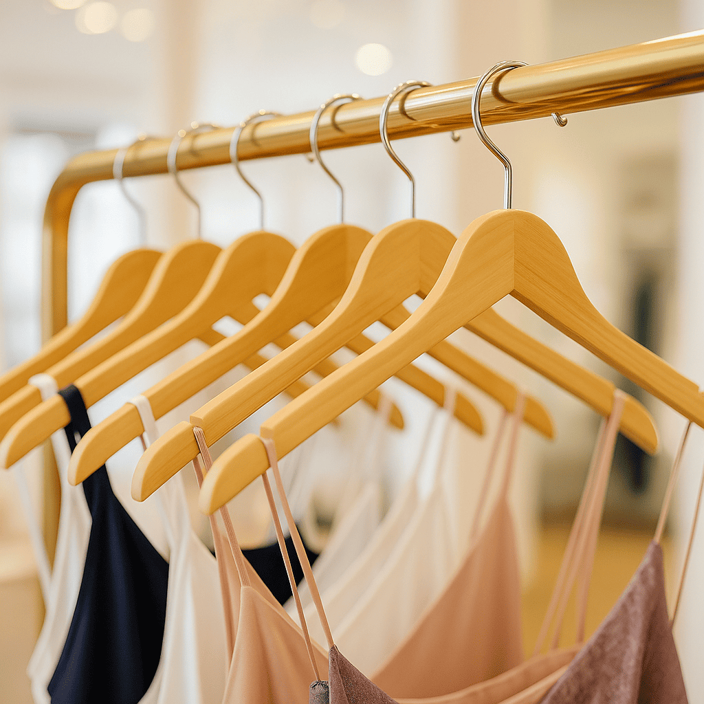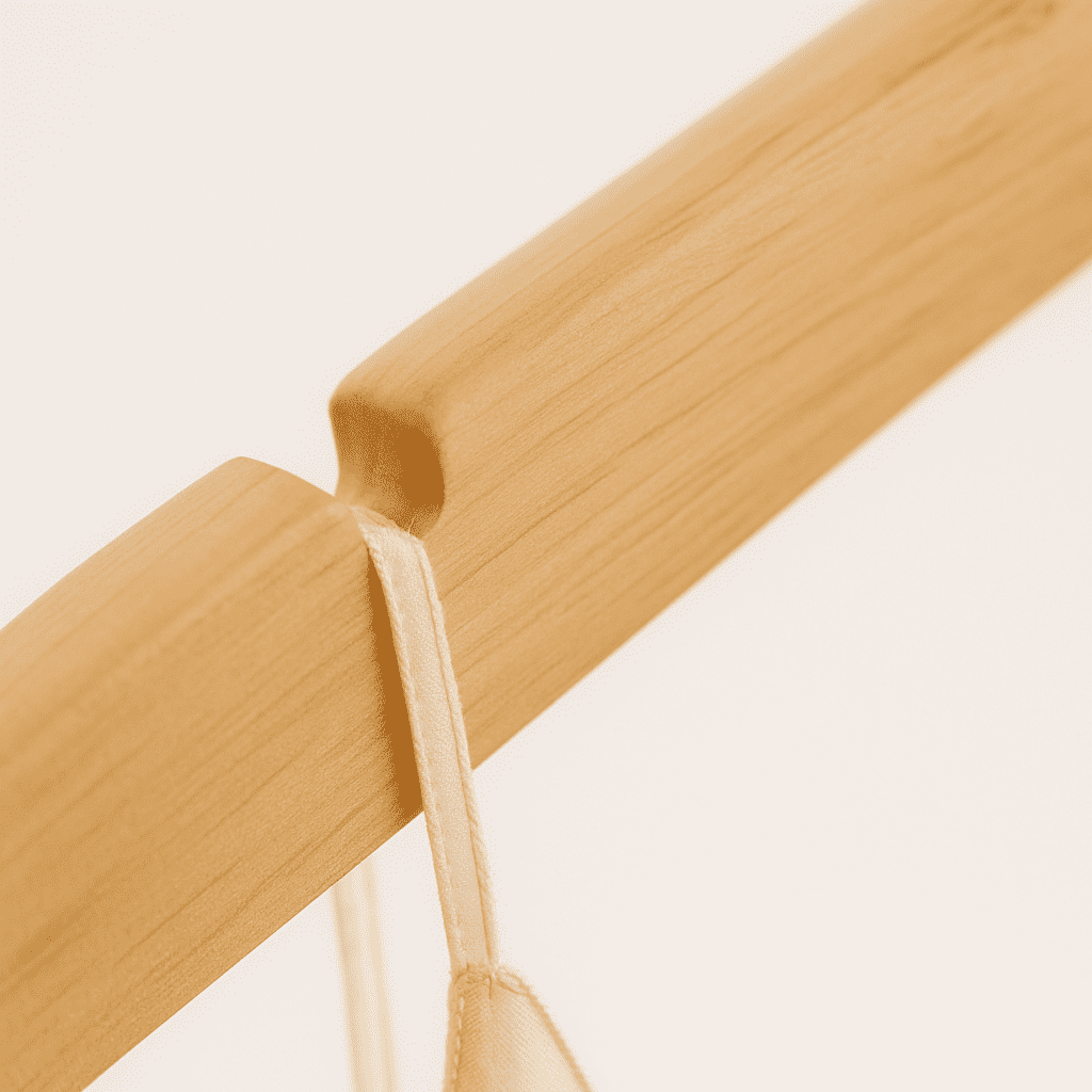 Der Universal-Holzkleiderbügel ist 44,5 cm breit und gewinkelt. Die Schulterauflage ist 14 mm breit. Der Kleiderbügel hat Kerben.