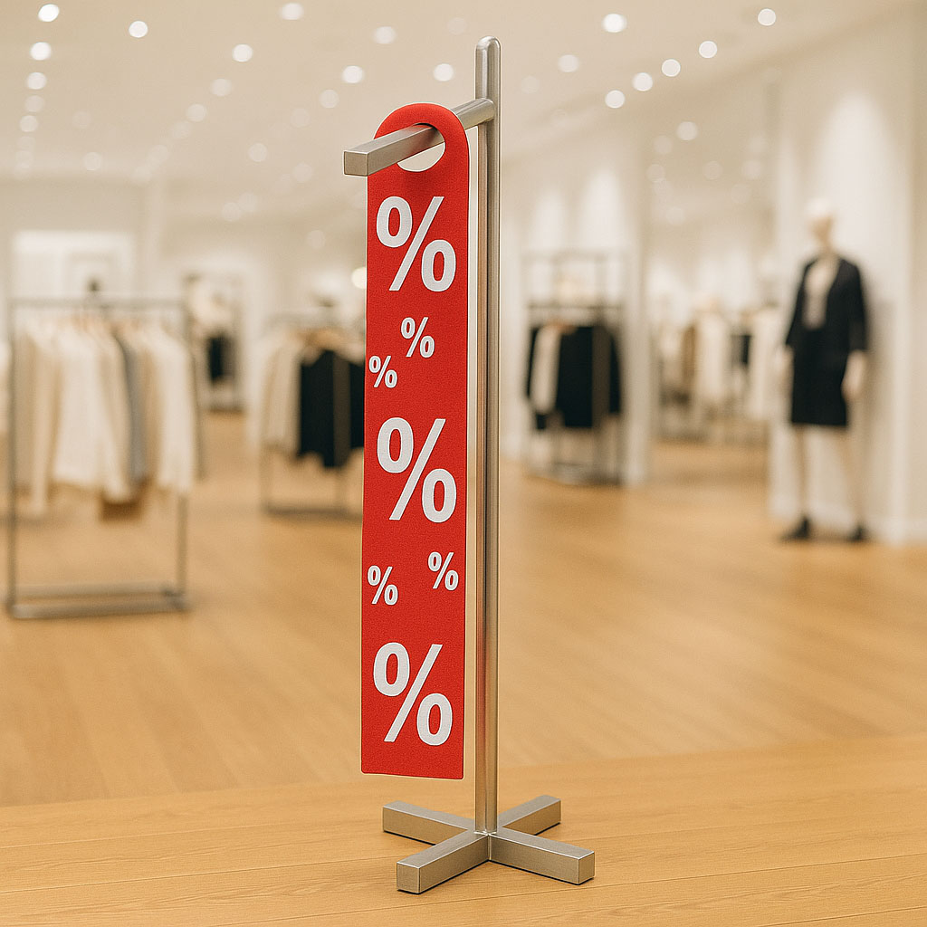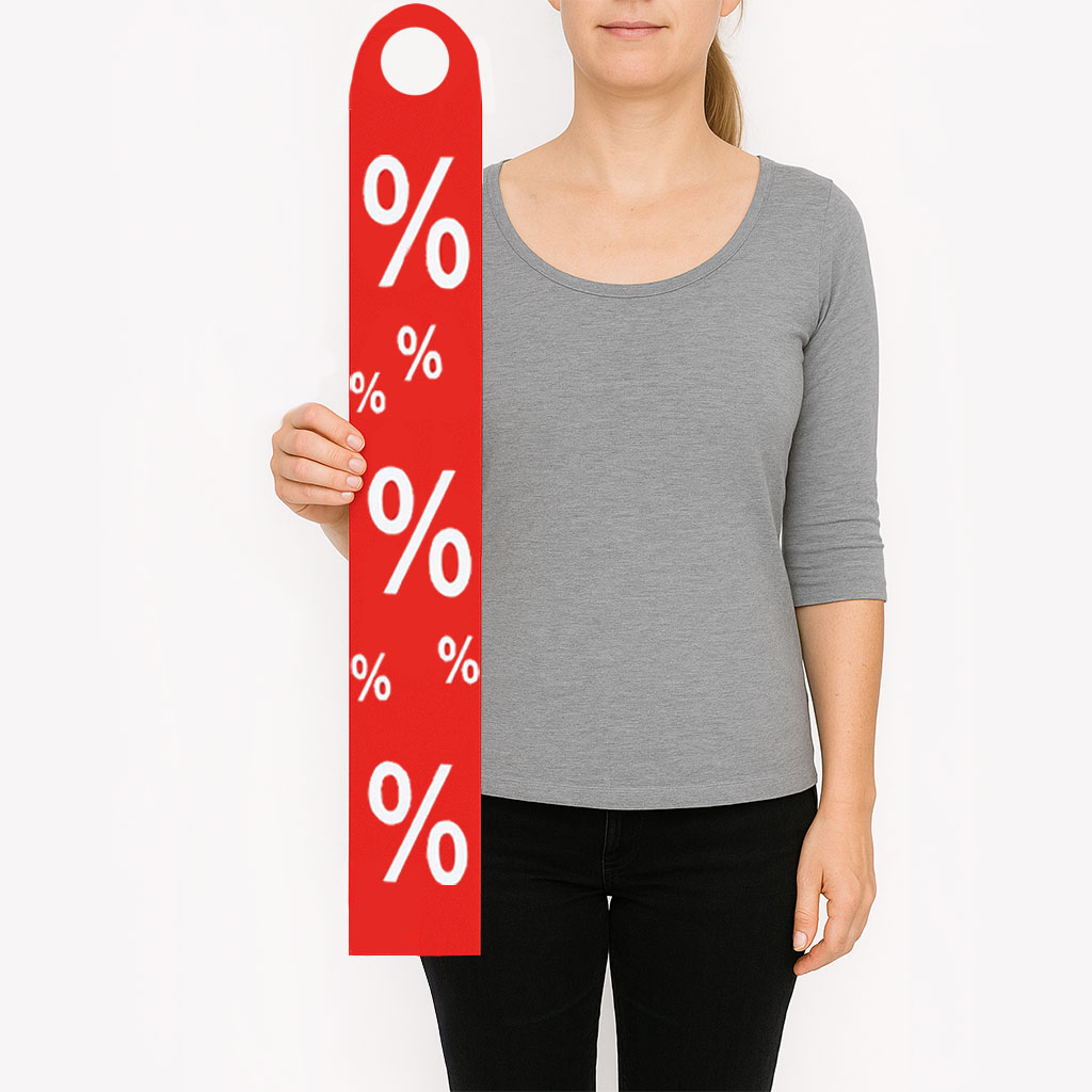 Für die Rabattkennzeichnung direkt am Kleiderbügel eignet sich dieser Hänger für Kleiderbügel aus Hart-PVC. Der Hänger ist rot mit weißem % Aufdruck. Die Maße des doppelseitigen Hängers sind 10 x 68 cm.