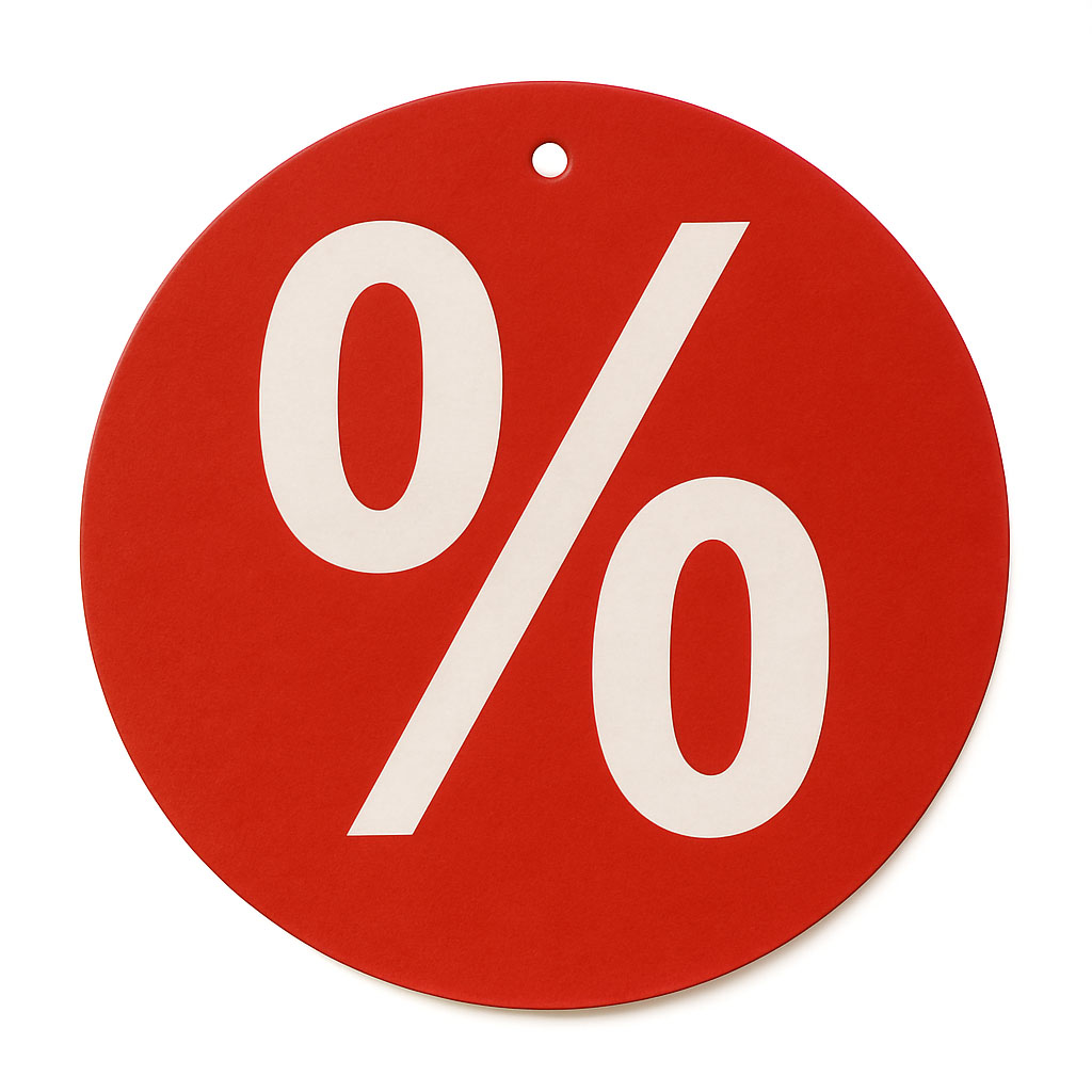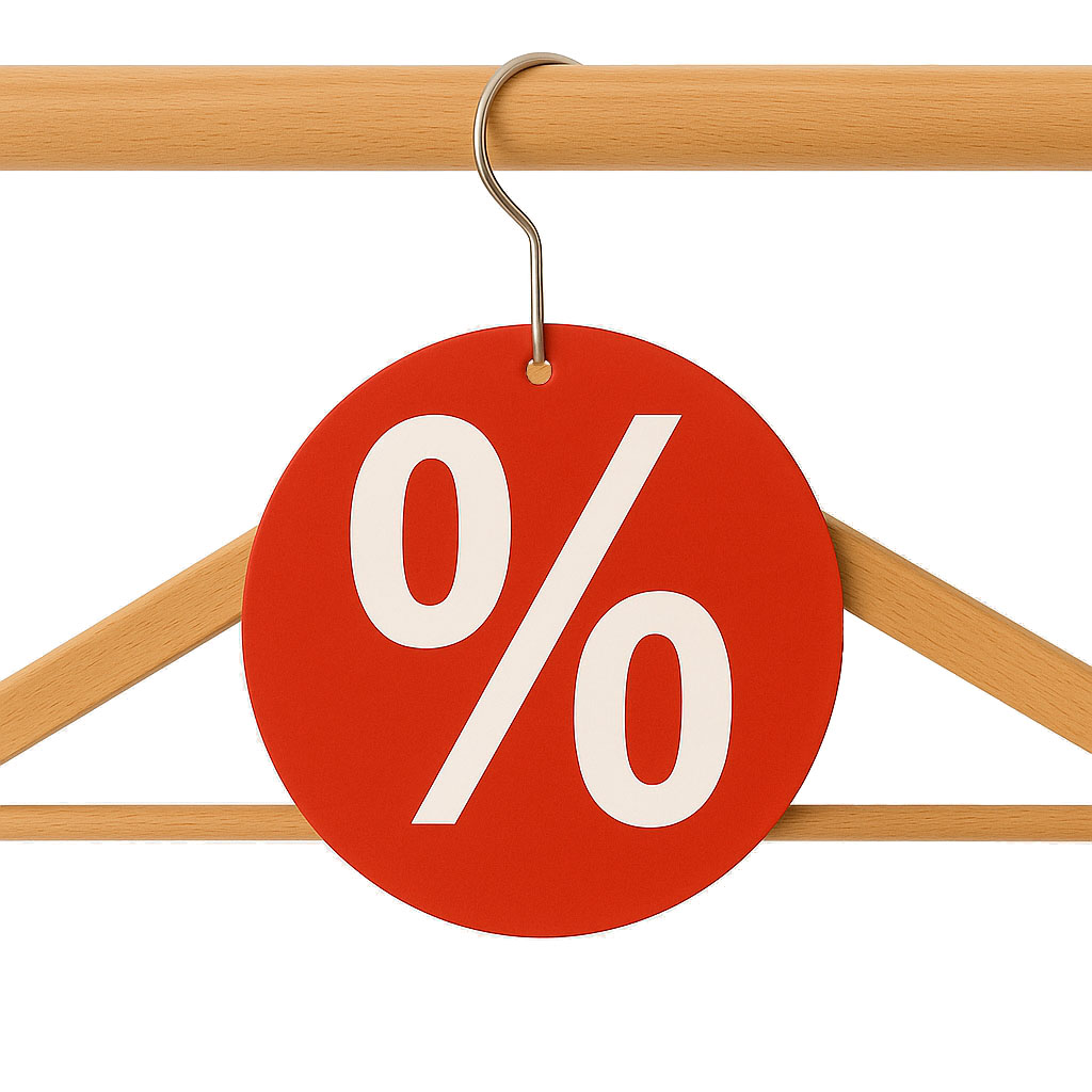 Für die Rabattkennzeichnung direkt am Kleiderbügel eignet sich dieser doppelseitige Hänger aus Karton. Der Hänger ist rot mit weißem '%' Aufdruck. Der Durchmesser ist 12 cm, die Verpackungseinheit 10 Stück. Der Preis ist pro VE.