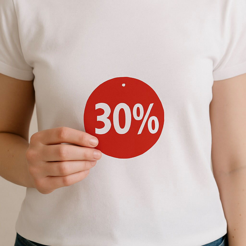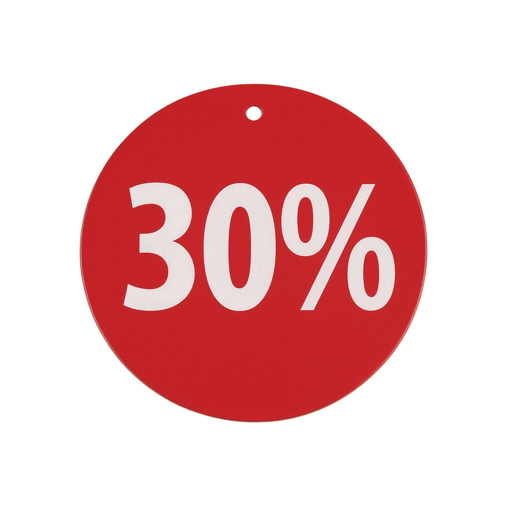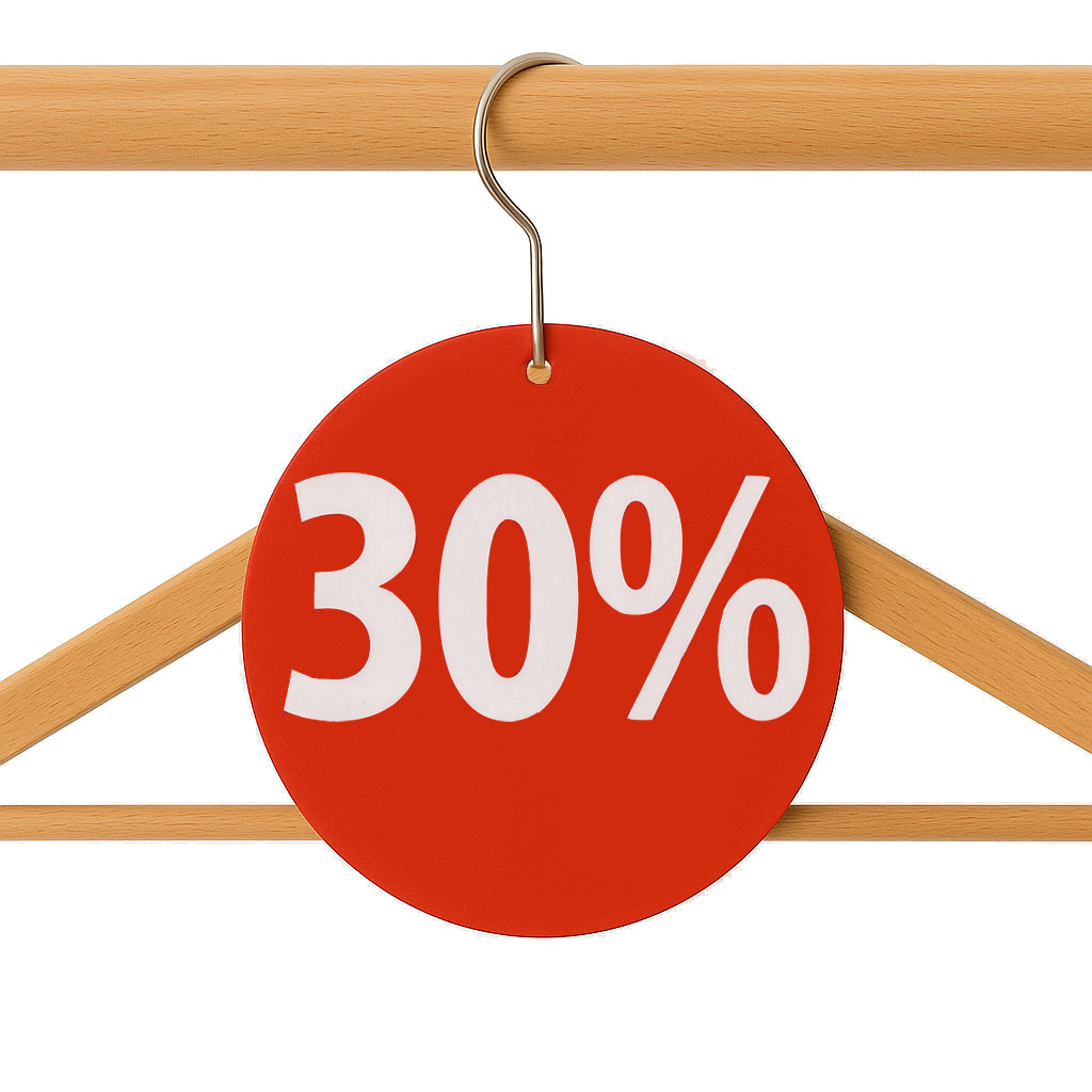 Für die Rabattkennzeichnung direkt am Kleiderbügel eignet sich dieser doppelseitige Hänger aus Karton. Der Hänger ist rot mit weißem '30%' Aufdruck. Der Durchmesser ist 12 cm, die Verpackungseinheit 10 Stück. Der Preis ist pro VE.