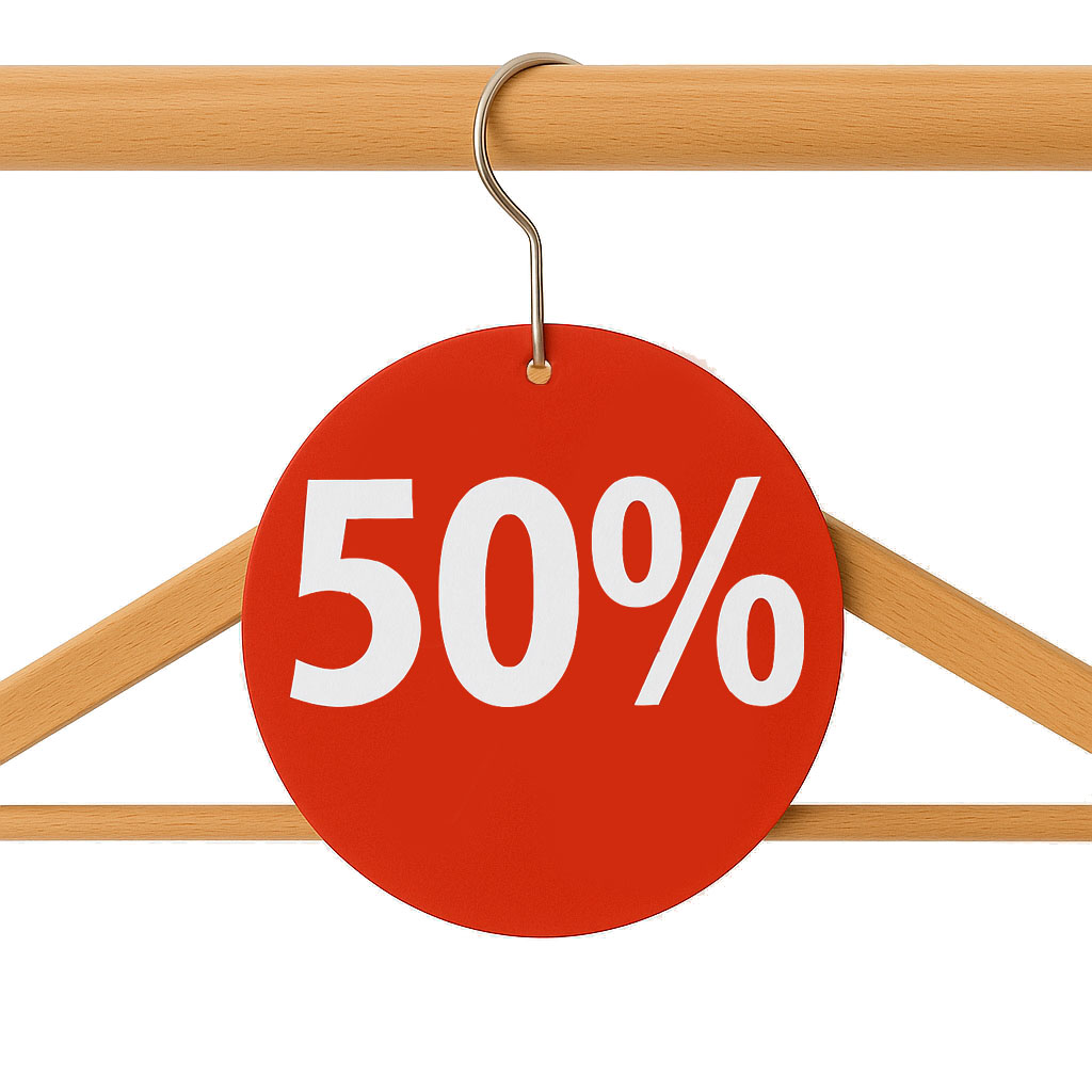 Für die Rabattkennzeichnung direkt am Kleiderbügel eignet sich dieser doppelseitige Hänger aus Karton. Der Hänger ist rot mit weißem '50%' Aufdruck. Der Durchmesser ist 12 cm, die Verpackungseinheit 10 Stück.