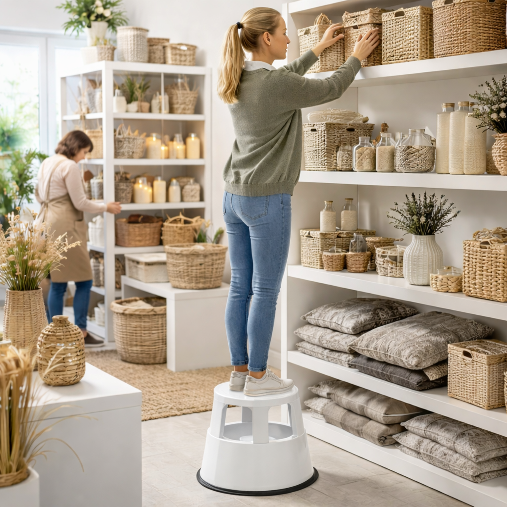 Der qualitative Rollhocker ist aus bruchfestem und wiederverwertbarem Kunststoff. Durch 3 auf Stahlfedern gelagerte Gleitrollen, ist der weiße Kunststoff-Hocker superleicht beweglich. Der Tritthocker hat einen integrierten Gummistandring am Boden und steht bei Belastung unverrückbar fest.