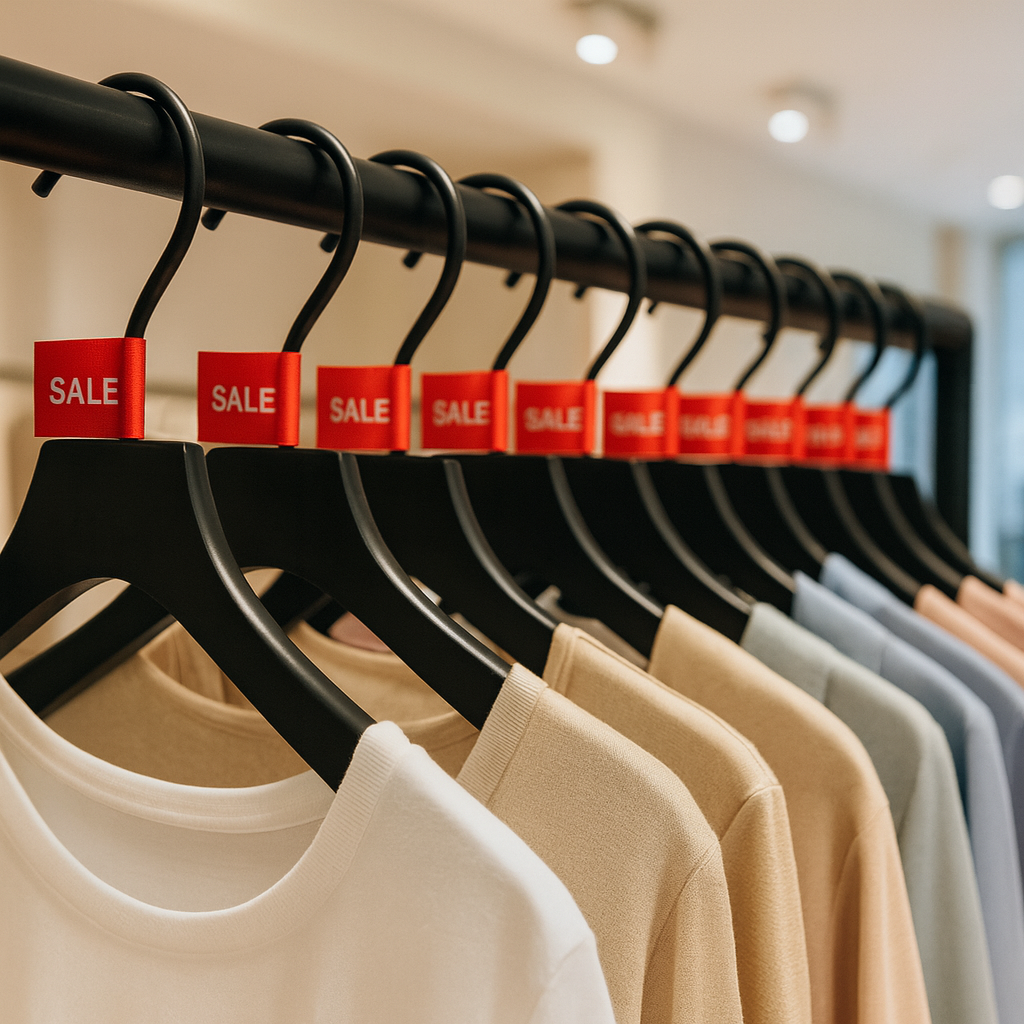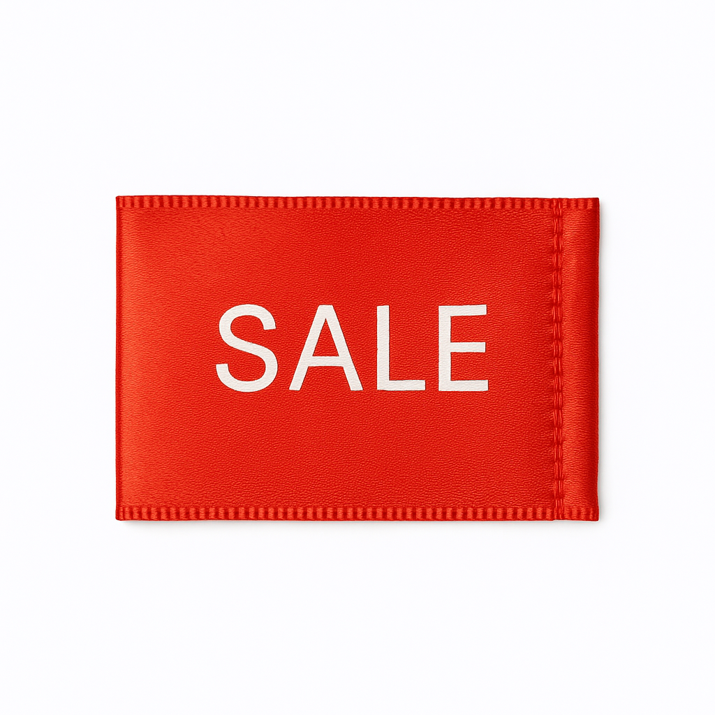 Die Bügelfahne aus Satin in der Farbe rot ist mit einem doppelseitigem weißen Aufdruck "SALE" versehen. Mit dem Textilfähnchen lässt sich kinderleicht reduzierte Ware kennzeichnen.