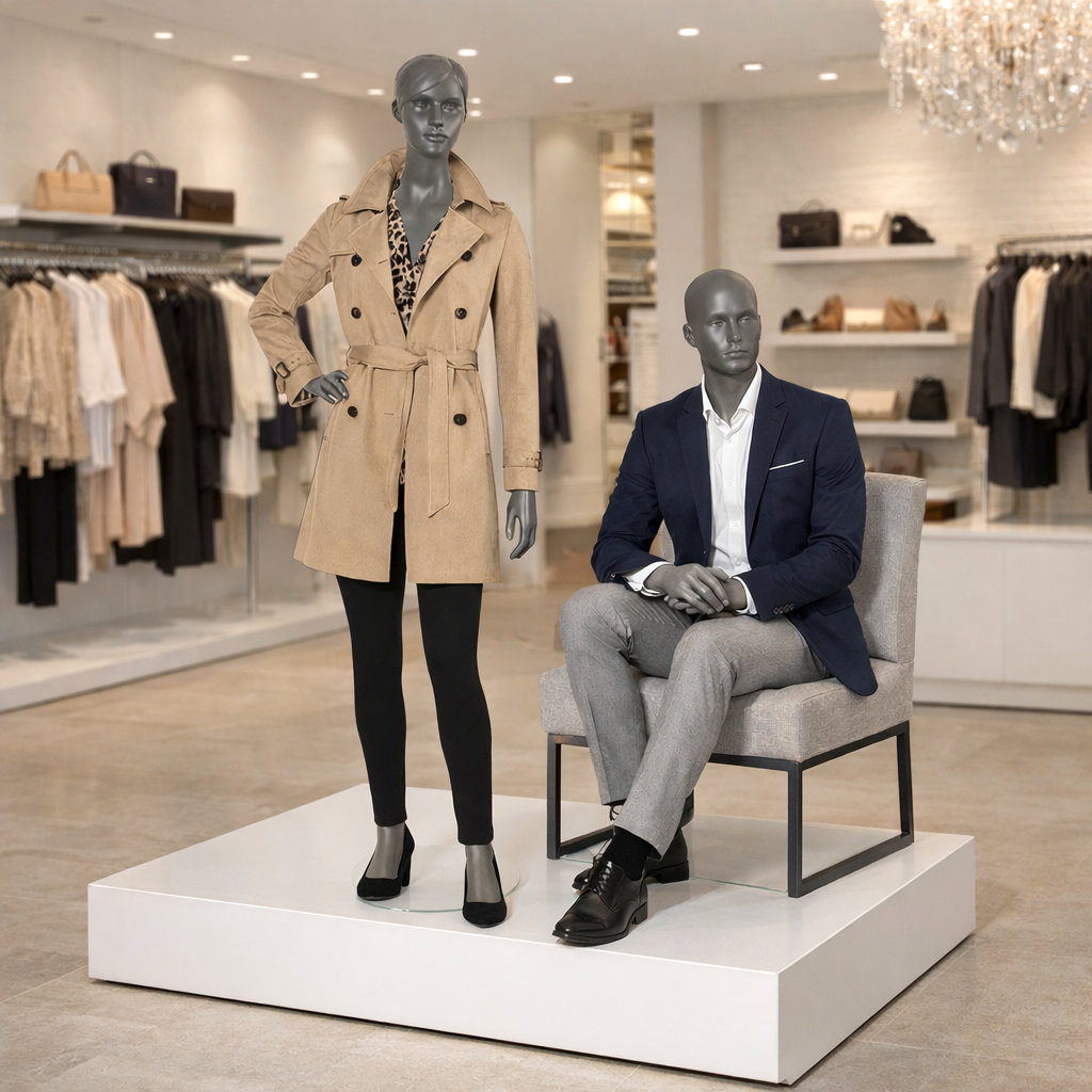 - Lieferumfang: Schaufensterpuppe inkl. runder Glasstandplatte