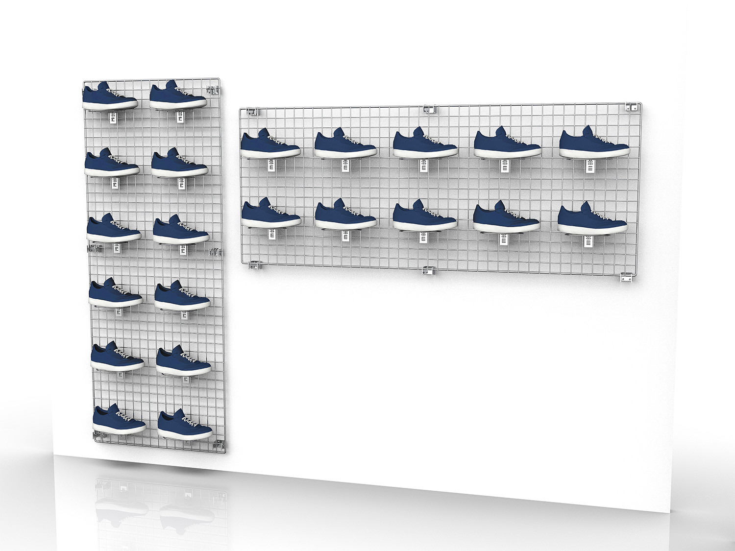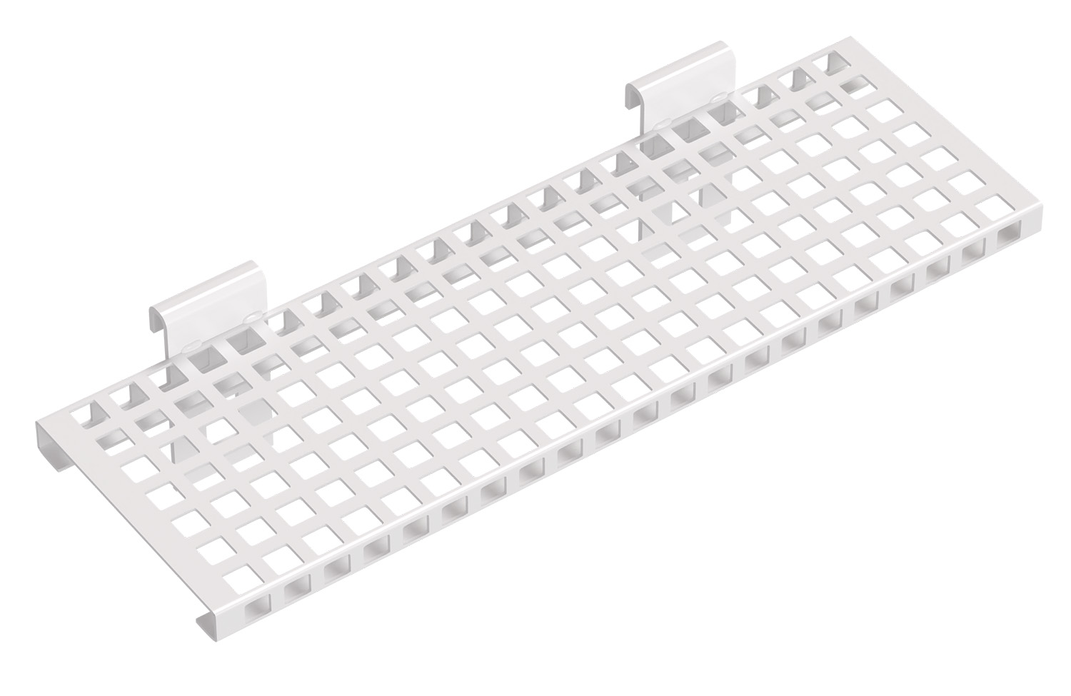 Die gerade Schuhablage ist aus weißen Gitter gefertigt und hat die Maße B 33 x T 10 cm.