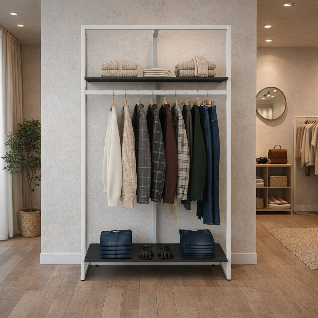 Moderne Textilgondel für die Warenpräsentation von Textilien im Textilgeschäft. Der Rahmen ist aus vierkantigem Metall mit 30x30 mm und in Farbe Weiß.